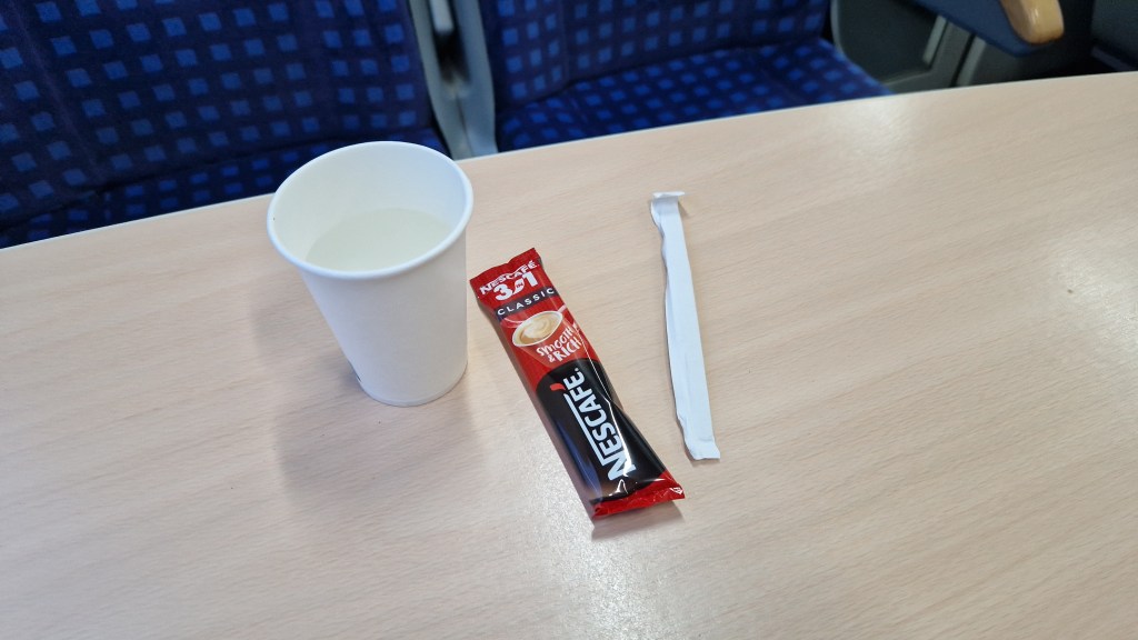 My first experience of the ‘catering’ onboard the train came just before the first stop at Karlovac, where the conductor came into first class with a silver tray of hot water, tea bags and instant coffee. I don’t know whether the offering is made in 2nd class, but even in 1st this limited ‘catering’ isn’t included and my Nescafé 3in1 sachet cost €1.33. Later in the journey there was a similar offering of biscuits and prepacked snacks, but I decided not to bother, partly due to the quality of the offering and partly due to a lack of cash.