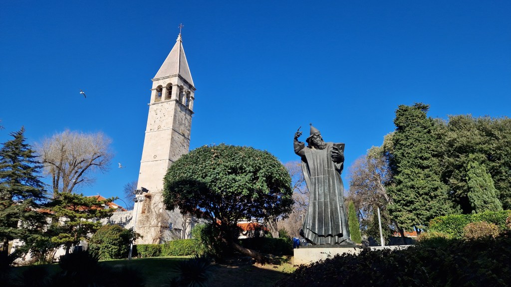 Another of the narrow streets took me to the northern edge of the old walled city and to the Golden Gate, the former main entrance to the walled city and via which the Emperor entered the complex. As such the gate has lots of alcoves where statues were once placed and was very elaborately decorated, however its importance diminished in the Middle Ages and at one point was in fact sealed. Next to the gate is a monument to Gregory of Nin, Bishop of Nin in the 10th century and who introduced the Croatian language into religious services against the wishes of the Catholic church. The large statue is a highly visited tourist attraction and it is supposedly good luck to rub Gregory’s toe, meaning it has been rubbed smooth and shiny as a result.