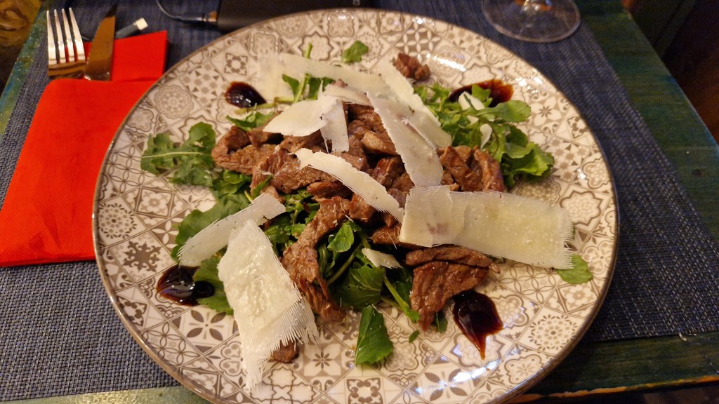 I’d read really good things about Villa Spiza, so I decided to have a main meal at lunchtime and started with the Tagliata, followed by Sote Stroganoff for my main. Sitting at the bar I was able to watch my meal being cooked and prepared and see the fresh ingredients going into it. I was also able to say hello the restaurant dog that was very well behaved and mostly sat watching the comings and goings. As I was on holiday I decided to indulge in a couple of glasses of wine and a dessert and all in all the delicious three course meal came to €48. One thing to note is that Villa Spiza doesn’t accept card, so make sure you have enough cash to pay for your meal before you pay them a visit.