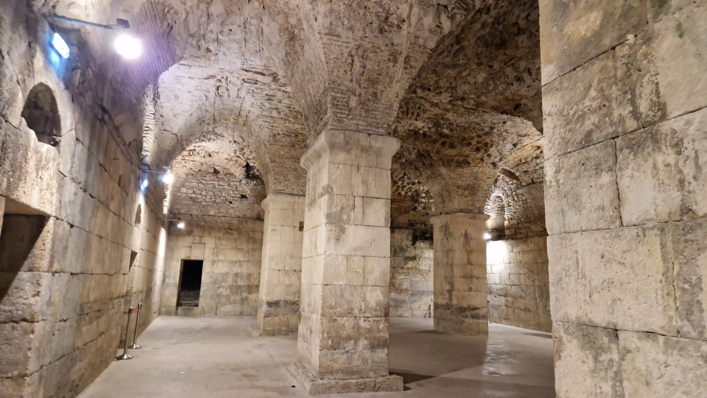 Walking back along the harbourfront, I saw what I thought would be a shortcut through the city walls back to the very centre of the old town and it was, but it was also so much more. The inconspicuous wooden doors in the wall lead to the substructure of the Diocletian Palace, and the central corridor is now home to stalls selling various wares. Either side of this central corridor are the depths of the substructure and you’re able to pay €8 to enter and explore.