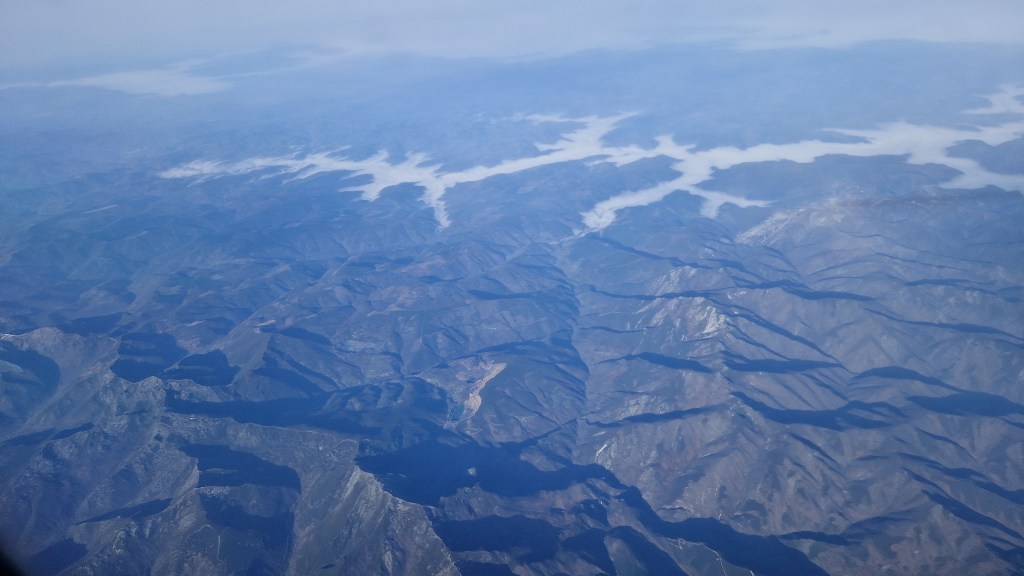 Just over 10 minutes later we crossed the Spanish coast to the west of the town of Gijón, however view of the coastline was still blocked by cloud. This finally cleared just after, providing great views of the mountains in northern Spain before we crossed the Spanish/Portuguese border after an hour and 45 minutes of flying, near the towns of Chaves (Portugal) and Verín (Spain). Our decent began as we headed down the centre of Portugal, with the city of Figueira da Foz visible on the headland out to our right and I was soon able to see the patchwork of green fields, trees, villages and towns.