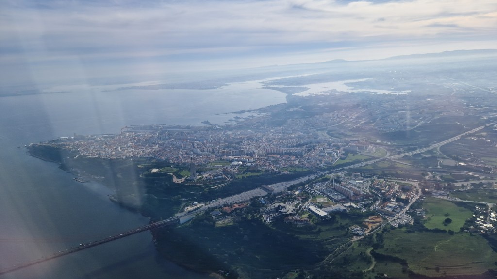 As we passed through 10,000 feet I was able to see the colourful hilltop observatory at Sintra and then the town of Cascais at the western end of the Lisbon conurbation. A wide turn over the estuary of the River Tagus took us over Cacilhas and Almada on the southern bank to line us up with Lisbon’s runway 03. As we flew back over the River, I was able to get a great view of Santuário de Cristo Rei, a giant statue of Jesus inspired by Rio de Janeiro’s Christ the Redeemer.