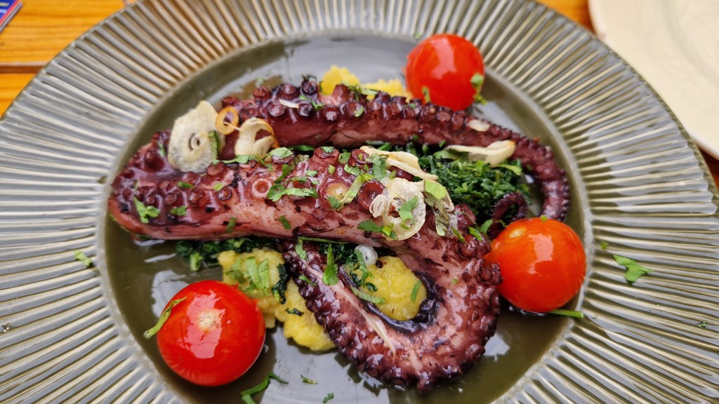 Whilst we decided not to visit the Castle on day 1, we did jump off the bus at the castle stop, planning on finding somewhere for a very late lunch under the lee of the castle walls. Just across the road we found Petisqueira Conqvistador, a delightful ‘hole-in-the-wall’ restaurant and were delighted to be able to sit outside and eat in early February. I opted for the Octopus with mash and Portuguese cabbage and, in a slightly embarrassing moment, was a bit shocked when the Octopus came actually looking like Octopus. I think I’d expected something a bit more like Calamari!