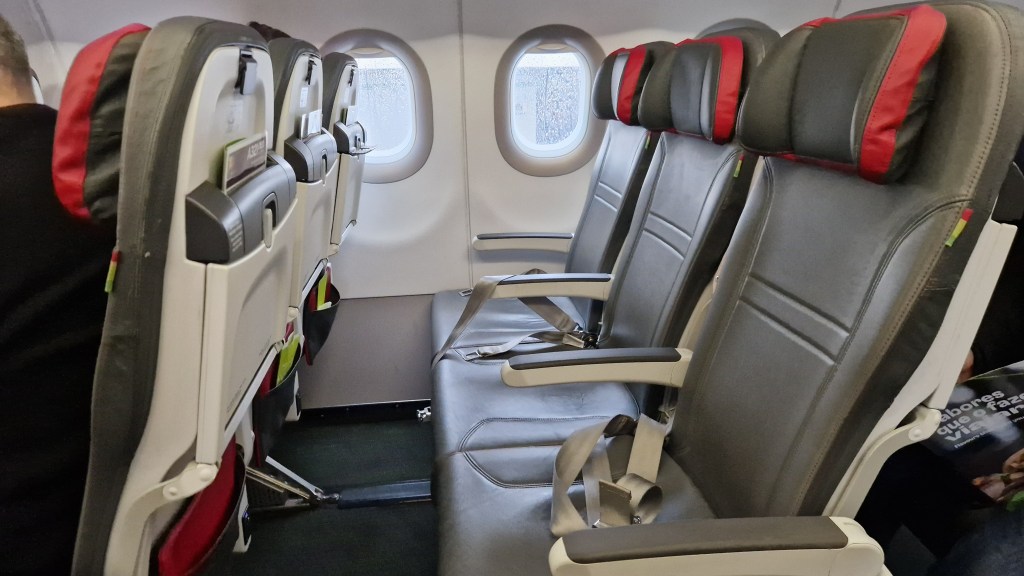 Our aircraft for the flight was CS-TJO, a four and half year old Airbus A320neo that can seat up to 221 passengers. Thankfully the flight was only half full and we ended up with a row of seats to ourselves, giving us space to spread out and for me to catch up on some sleep without risking falling asleep on a stranger. As with most ‘full service’ airlines, TAP has the cabin installed so the amount of Business class seating is flexible and seemingly high bookings led to our seats being changed from row 7 to row 11.