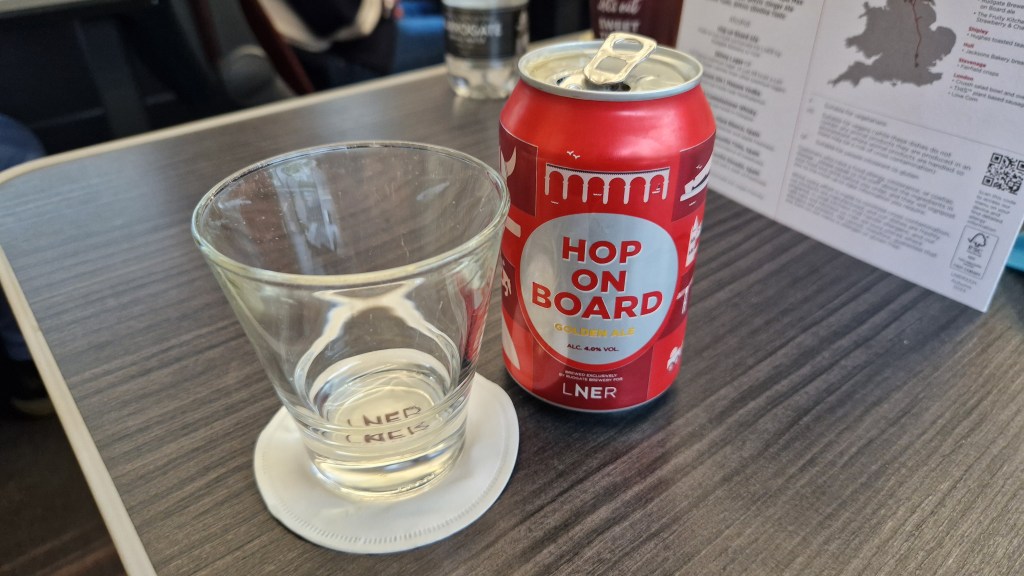 As we continued at speed towards the border, we had a new crew onboard, including the partner of one of my colleagues, and we had an afternoon offering of snacks and drinks brought around with me opting for some crisps, a raspberry mousse pots and a beer. For this part of the journey the ECML follows close to the coast, and I was able to see the famous Holy Isle. Lindesfarne, or Holy Isle, is a tidal island with a causeway that gets covered by the sea at high tide cutting it off from the mainland. We clearly passed whilst the tide was out as I could see lots of vehicles crossing the causeway in the distance.
