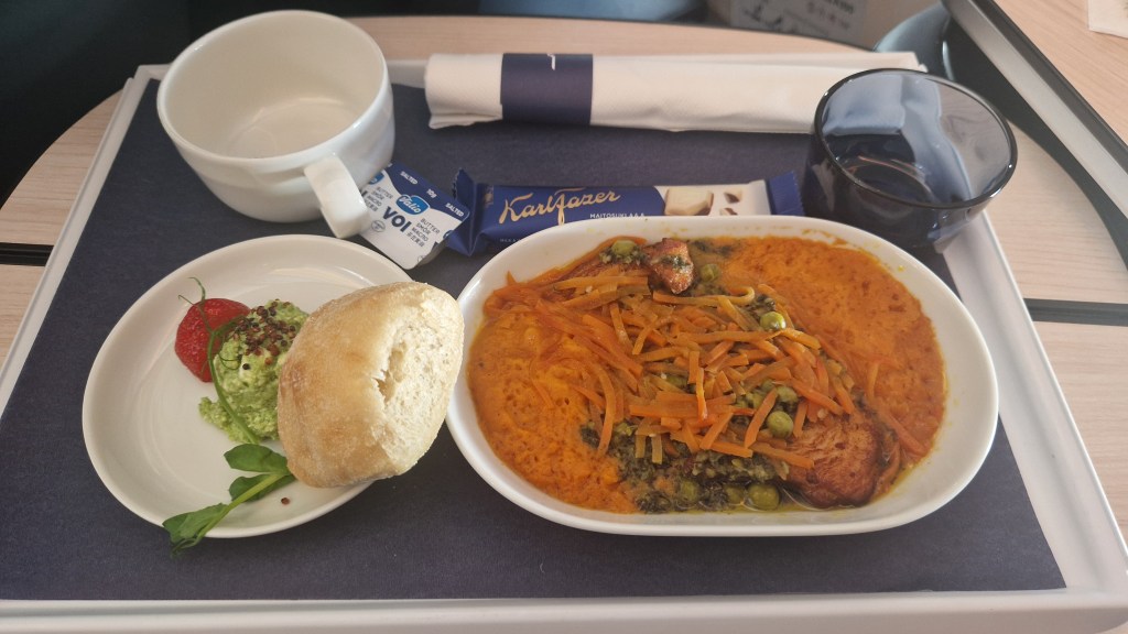 Whilst waiting for the in-flight meal to be served, I watched a Finnair 100 Years mini-documentary on the IFE and then settled in to a few episodes of Friends to tide me over. The meal was a chicken breast served with peas, carrot mash and a sauce, followed by a feta cheese and strawberry desert(?) and a chocolate bar. Whilst some of the flavours were a bit interesting (the peas had been cooked in a style I hadn’t come across before), everything was delicious and overall really good for airline food.