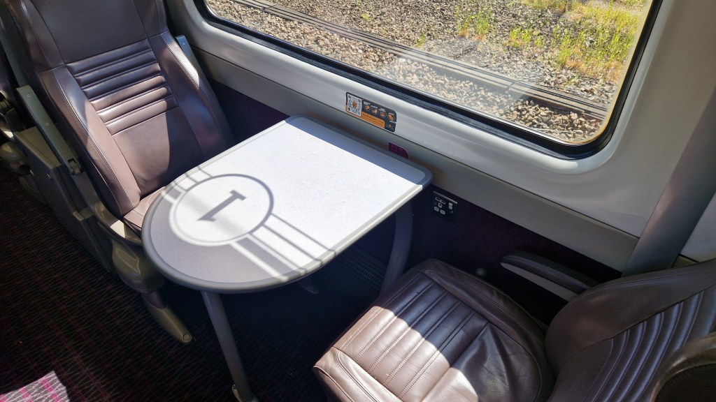 Clearly whoever made the decision about demand was correct as when the tired class 180 pulled into Peterborough there were quite a few of us waiting to board what was already a relatively busy service. Grand Central’s 1st Class is laid out in a 2-1 configuration with leather seats, and I ended up in a forward-facing seat around a table on the single side of the aisle, a couple down from my reserved seat which had been taken by someone else.