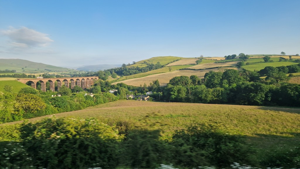 As the hills of the Lake District started to make themselves known, the first point of note was between Carnforth and Holme as we passed a very distinctive large hill, which after some research I found to be Hutton Roof Crags. Next up, just north of Grayrigg, was Low Gill viaduct, a former railway viaduct that carried the Ingleton Branch Line from the WCML across the valley of a beck near the hamlet of Beck Foot. Despite having been disused since 1954, the viaduct remains a prominent landmark and holds Grade II listed status with Historic England. The final noteworthy point from the run between Lancaster and Penrith was crossing Shap Summit, the highest point of the WCML in England, although in reality this wasn’t even noticed by the Pendolino powering its way north.