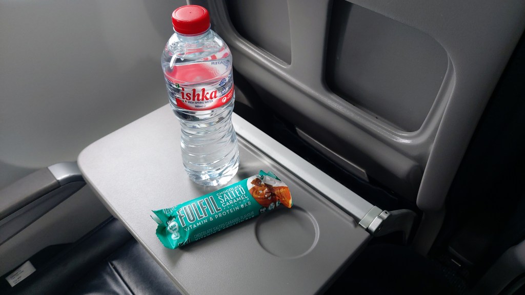 Despite Aer Lingus Regional’s longest route being a seasonal flight to Brest in northern France, there is a limited range of drinks and snacks available to purchase during the onboard service. Be warned though, it is a limited choice, with the most substantial snack being a protein bar, so if you think you’ll get hungry make sure to stock up before boarding. Being at the back, I was the last to be served, however thankfully with only 18 rows it didn’t take that long and the service was easily completed during the short flight, although I don’t think I’d have had time for a coffee to cool to a drinkable temperature before landing. Opting for a protein bar and a bottle of water, I paid the princely sum of €5.50, although this is probably comparable to buying the same from a high-street WH Smiths these days.