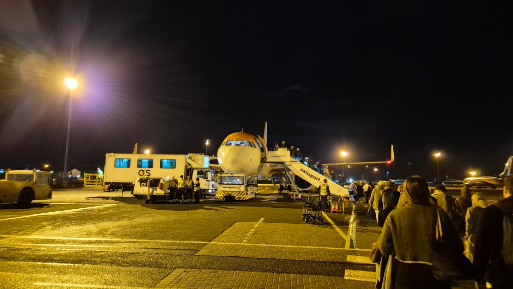 With the inbound flight having arrived, I was able to see that our aircraft was G-UZLB, a five-year-old Airbus A320neo. Whilst easyJet does have Belfast based aircraft, G-UZLB was a Luton based aircraft and had arrived in from the ‘London’ airport having already operated a round trip to Lanzarote earlier in the day. Once the inbound passengers had all disembarked, #BoardingNotBoarding began around 1900, with us all having our boarding passes scanned and waiting on the stairs, with a mess of people waiting at the bottom by the door to the ramp. A crowded 10 minutes later, we were thankfully allowed to boarding properly and headed out onto the ramp to board via stairs.