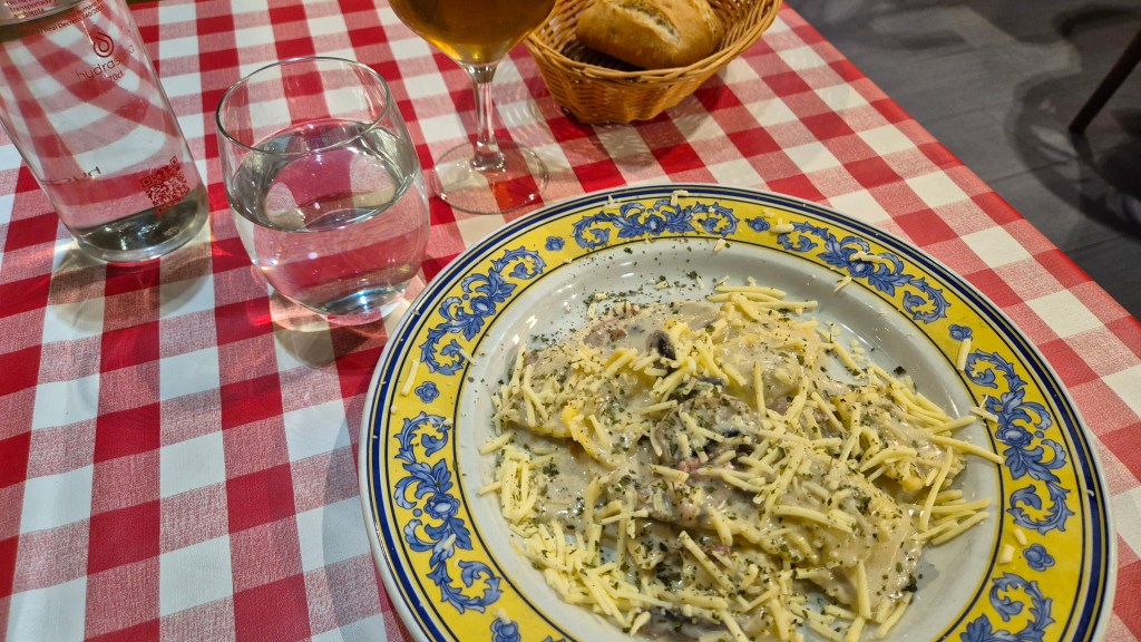 With the walking tour drawing to an end, we headed back to the Arriaga Theatre to learn about the history of the Gugenheim Museum and how its arrival in Bilbao jump started the city’s tourism industry and revitalisation. Having tipped the guide and made the few minutes’ walk to my hotel to drop off my stuff, I headed back out to a nearby restaurant, Olagarro, to try out their set menu. Lots of restaurants in the old town seemed to do daily set menus for around €20, which for a three-course meal and a drink seems like an excellent deal. I chose the ravioli as a started, followed by some delicious pork cheeks for my main course. A Tarte San Marcos rounded of the meal, and it was all washed down with a glass of the local lager, making for an excellent meal.