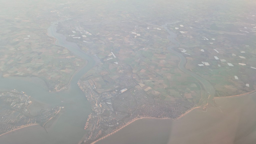 With a scheduled flight time of 1 hour and five minutes, I was pleased to hear in the Captain’s welcome announcement that we’d only actually be in the air for 45 minutes, and would be cruising at a lowly 21,000 feet. The aircraft doors were closed at 0621 and five minutes later we were pushing back, starting our taxi a few minutes after that. As we taxied the length of the airfield to join our place in the queue for departure, we passed the freight apron where Asiana Boeing 747F HL7417 was parked having arrived as flight OZ893 from Almaty, Kazakhstan. Rolling down runway 04, we took off at 0638 and as we climbed from the runway I was able to see the UK Government Airbus A320 parked up on the north side of the airport.