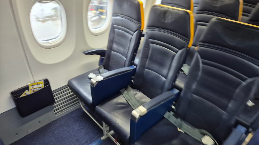 Just over ten minutes after ‘Boarding’ started, we were finally allowed onboard the aircraft and I was soon settling into my seat, 2F, a front row window seat on the right-hand side of the aircraft. As well as having great leg room whilst not being an emergency exit seat (the bulkhead and galley are where row 1 would be on this side of the aircraft), row 2 also has a decently placed window, allowing for some plane spotting whilst waiting for boarding to finish. The aircraft for the scheduled hour and 20-minute flight across to Germany was EI-GXL, a six-and-a-half-year-old Boeing 737-800 which had been delivered new to Ryanair. The aircraft had been on the ground since around 1930 the previous evening when it had arrived back to Ryanair’s largest base from the Greek island of Santorini.