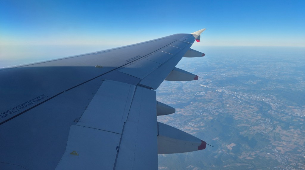 We were flying on a beautifully clear day and, despite the challenging window placement, I was able to get a reasonably good view during departure and could see the very industrial Hellibron on the river Nacker, as well as the unfortunately named Hugo-Koch-Stadion of VfB Eppingen. As we continued to the north-west, we flew over the southern end of the Rhein conurbation around Speyer and Frankfurt. It was around here the crew began the onboard service, with us once again receiving free bottles of water and biscuits, although we decided not to buy anything from the trolley on this occasion.