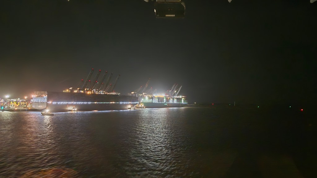 Our ship for the overnight crossing was the Stena Britannica, a Ropax ferry and one of a pair of sister ships specifically built for this route across the southern North Sea. With a max speed of 22 knots (41 km/h), the Stena Brittanica has 538 cabins and has been operating on the Harwich to Hoek van Holland route since 2010. When we reached our cabins, we were pleasantly surprised as they were much larger than the ‘sleeper’ size cabins we were expecting. All cabins have an ensuite with toilet, sink and shower and our “2 berth outside bunk-bed” cabins were the cheapest option apart from the equivalent interior cabins, although they can also be booked as three-berth as the bottom bunk is double bed sized which I think is cheaper per person. Our cabins were right at the front of the ship in the middle and had huge windows allowing us to look out on the glistening lights of the port and watch the last of the cargo trailers being loaded.