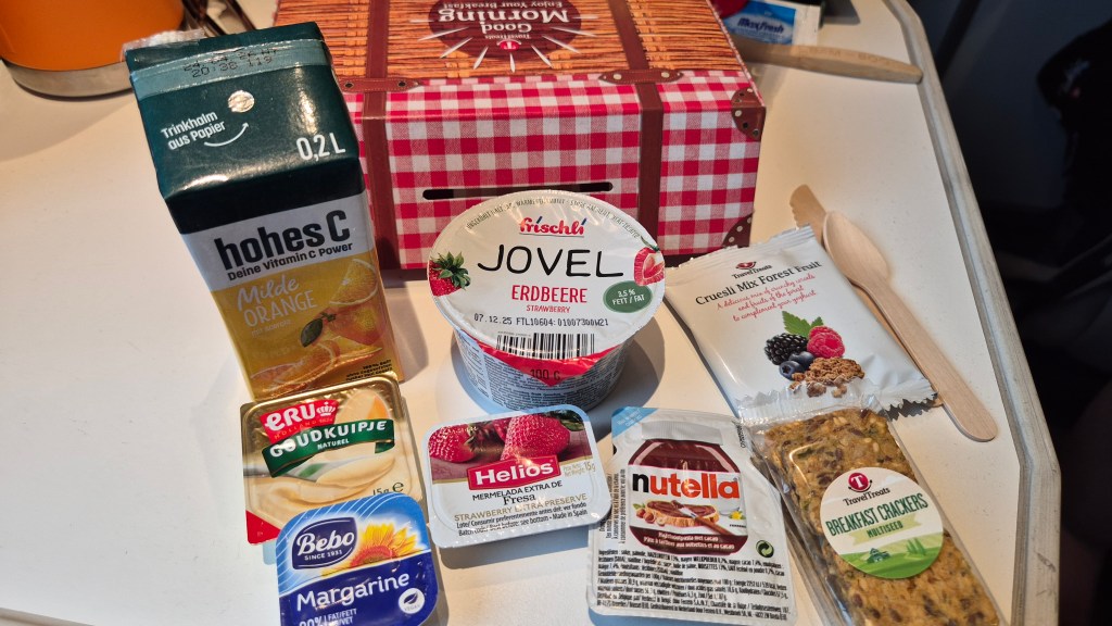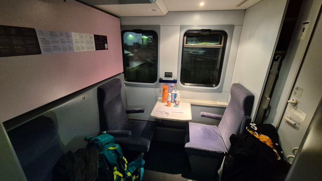 As hinted at above, the doorways and corridor of the sleeper coach are quite tight and can be a challenge to negotiate if you’ve got bulky luggage, and I found it easier to board wearing my hiking rucksack and then taking it off in the vestibule before making my way down the corridor. Our rooms weren’t yet made up for sleeping, with the lower two bunks still folded up to allow us to make use of the seats for a while before heading to bed. Comfort plus tickets on the European Sleeper include a welcome drink from their small menu which includes alcohol, and our host then gave a welcome talk and delivered our breakfast boxes shortly after we departed. Unfortunately, despite European Sleeper having introduced one earlier in the year, our service didn’t have a dining car and so we relaxed in our rooms for a while after leaving Roosendaal.