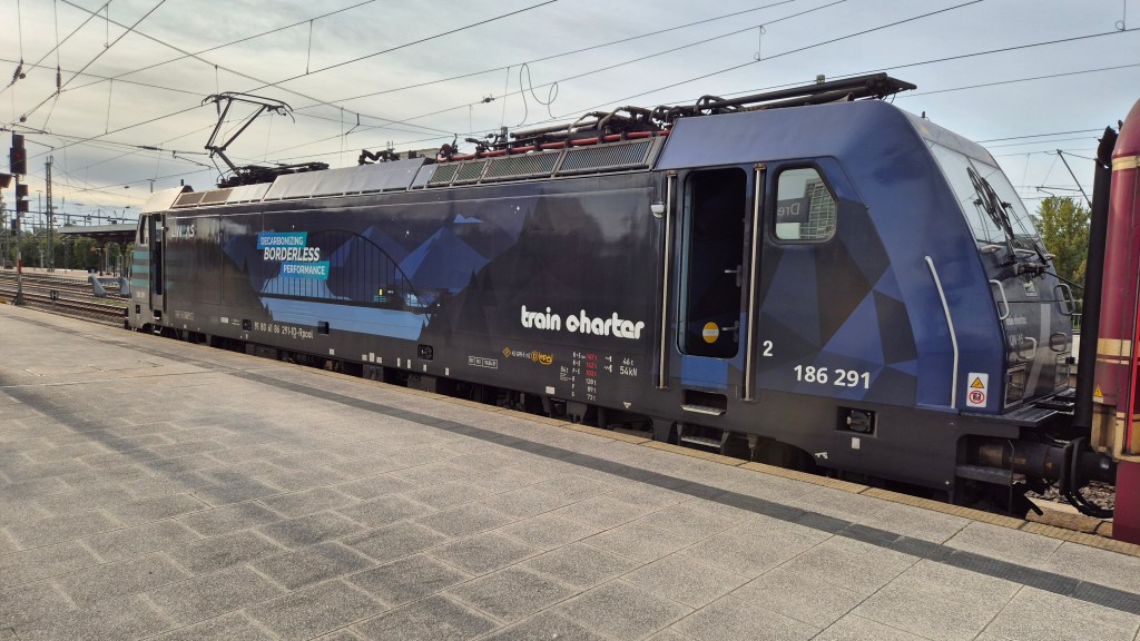 After a few more hours sleep I woke again briefly during the Berlin stop around 0600 and then ended up waking properly as we headed through the southern Berlin suburbs although I was initially a bit confused as at some point during the night the loco had run round the train, and we were now travelling in the opposite direction. After getting ourselves sorted for the day ahead, we settled down for the last hour or so of the journey with our breakfast boxes which included plenty of ‘snacky’ foods along with some orange juice and a coffee that was delivered fresh by the host. Around 0830 we entered the northern edge of the Dresden conurbation and, after crossing the Elbe, arrived at Dresden Haupbahnhof a few minutes early at 0847, allowing me to grab a final few pictures of the locomotive and sleeper coach.