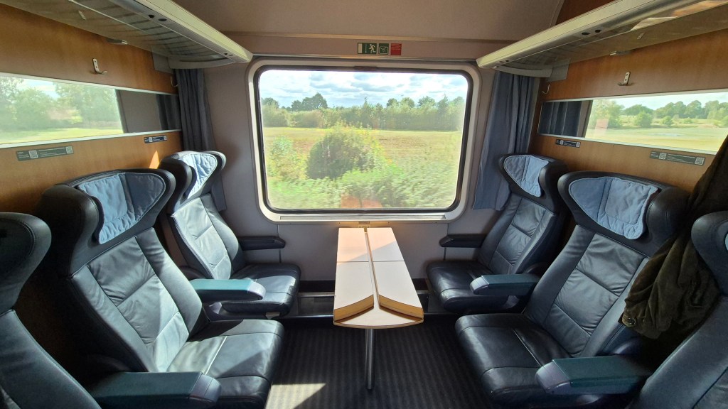 We arrived at Hannover Hbf around 35 minutes before our train, IC146 was due to depart, with the collection of DB carriages hauled by an NS (Dutch Railways) locomotive arriving at 1152. IC146 is the 0953 service from Berlin Ostbahnhof to Amsterdam Centraal which calls at Berlin Hbf and Berlin Spandau before we joined the train at Hannover. After departing Hannover there would be 8 stops before where we would alight at Hilversum, which would be the service’s penultimate stop. Our seats were in a compartment in coach 31, the second from the rear of the train, and this first-class compartment had two other seats alongside our four.