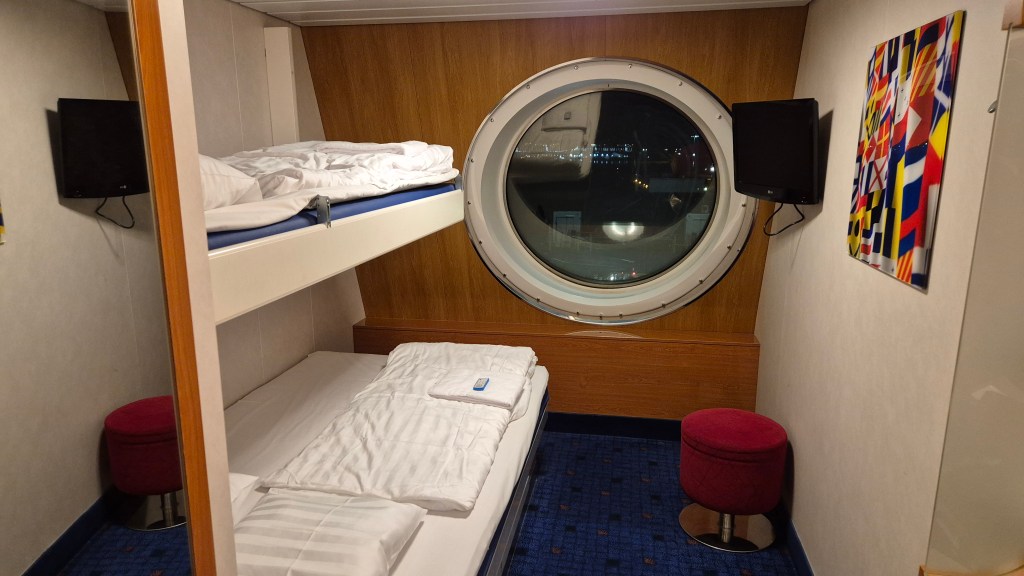 With the foot passenger gangway entering the ship on deck 7, there’s then two lifts to take to reach the passenger cabins on decks 10 and 11. The first takes you up to deck 9, the main deck with the restaurant, duty free and other passenger amenities, with the second then taking you up to decks 10 and 11. Unfortunately this second lift is shared with passengers coming up from the car decks meaning it can be very busy and there is a bit of a wait at times. There are also stairs, but when you’ve got large bags these aren’t really an option, so after waiting for the lift we were in our cabins just before 1930.