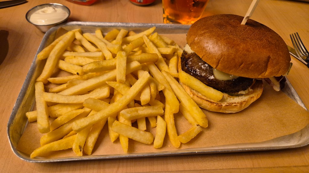 Heading down to the restaurant for dinner, we were able to get a window table at the front of the ship and as we settled down to eat, the Stena Transit departed for its journey to the Lincolnshire coast. For dinner we went for the Stena Burger (essentially a bacon and cheeseburger) and the Mushroom and Spinach risotto which were both tasty. Unfortunately, the loaded fries that we’d also ordered had some weird sauce on them that wasn’t particularly nice and so most of these went to waste. Obviously, food costs a bit more than it would for the equivalent in a normal restaurant as the market is pretty captive, however its not as extortionate as it could be which is good.
