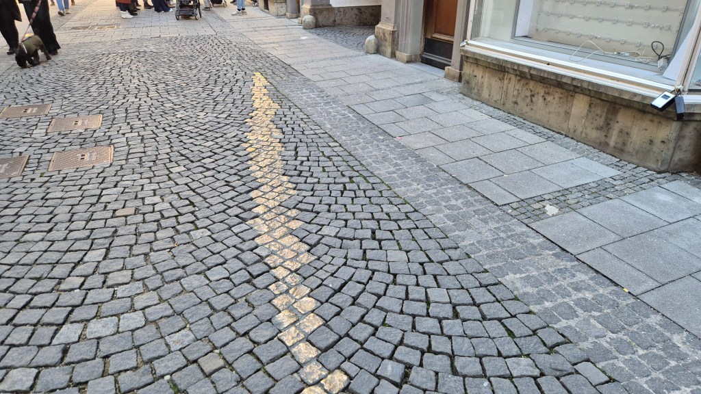 Heading through the gated passageway into the courtyard of the Neus Rathaus, we learnt a bit more about the history of the building and the glockenspiel before heading out to Odeonsplatz. Here we were told about Munich’s darker past, being a key location in the rise of Hitler and the Nazi party, and also about those that resisted the Nazi regime who are commemorated by the golden pathway on Viscardigasse. In Odeonplatz we were also close to the Residenz München which dates from the time of King Ludwig and Queen Therese, whose marriage celebration was also the original Oktoberfest, the popular beer festival that is held annually on the Theresienwiese outside the city centre.