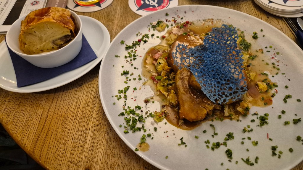 At the far side of the Viktualienmarkt is Der Pschorr, a beer hall run by the Hacker-Pschorr Brewery (one of the six Munich breweries) where we decided to stop for lunch. We were sat up on the mezzanine floor so had a nice lazy lunch whilst people watching, with the pretzel carpaccio being my starter and both of us choosing the veal shoulder for our main. I don’t know what it is about German beer houses, but I am yet to have a bad meal at one and Der Pschorr was no different as we enjoyed an excellent meal. Obviously being in a beer house we went for the home breweries beer, starting a mini challenge to try all six breweries before we went home.